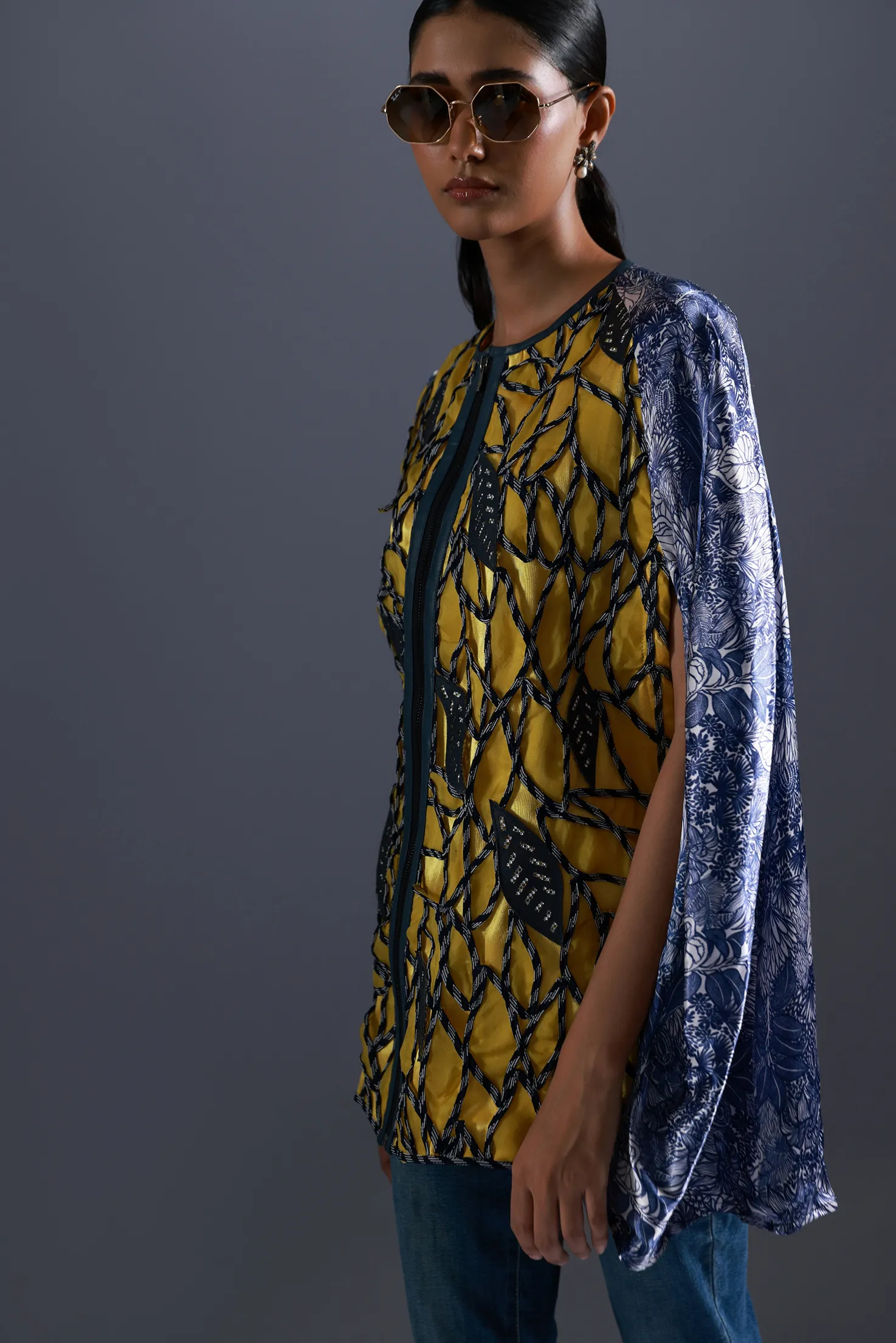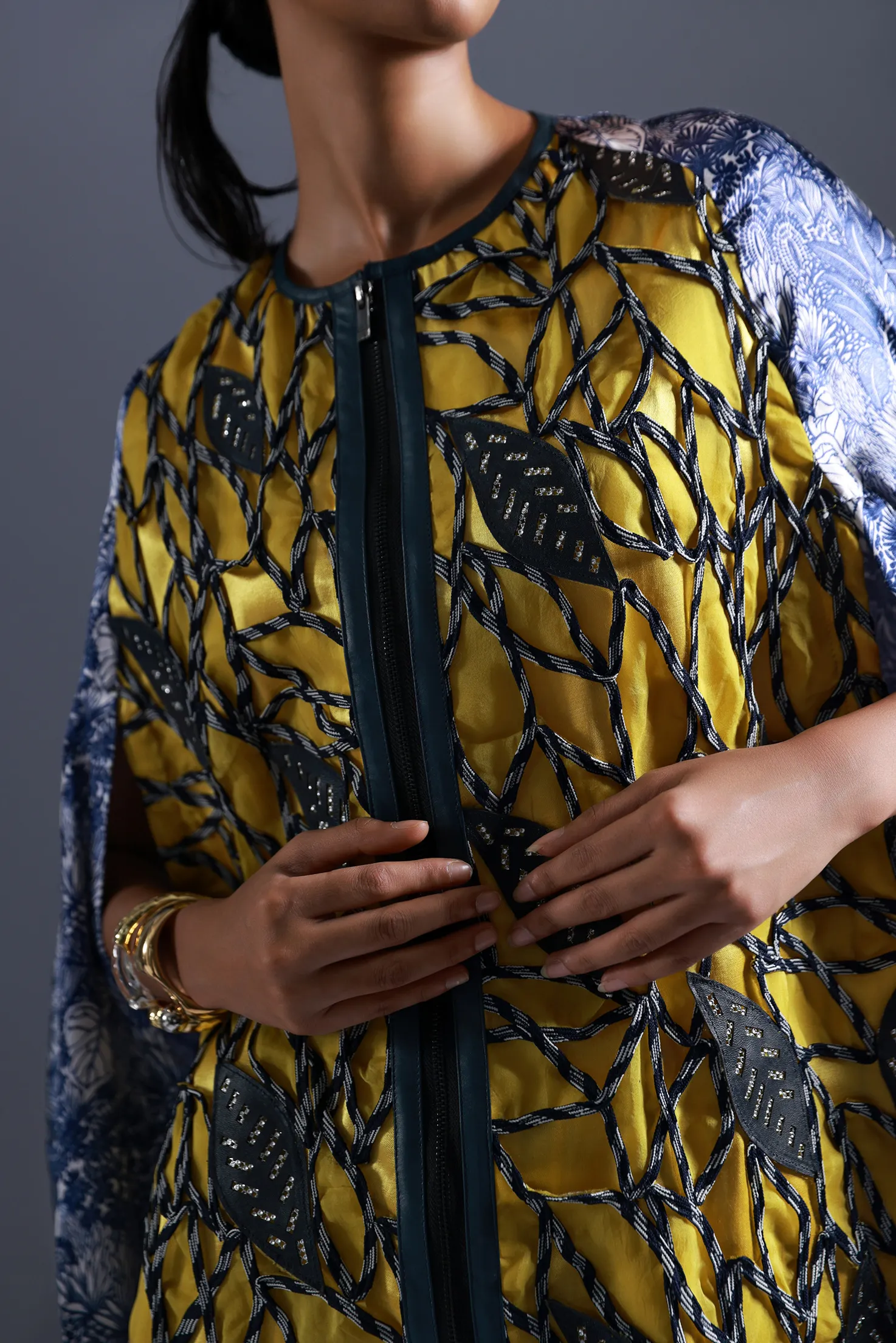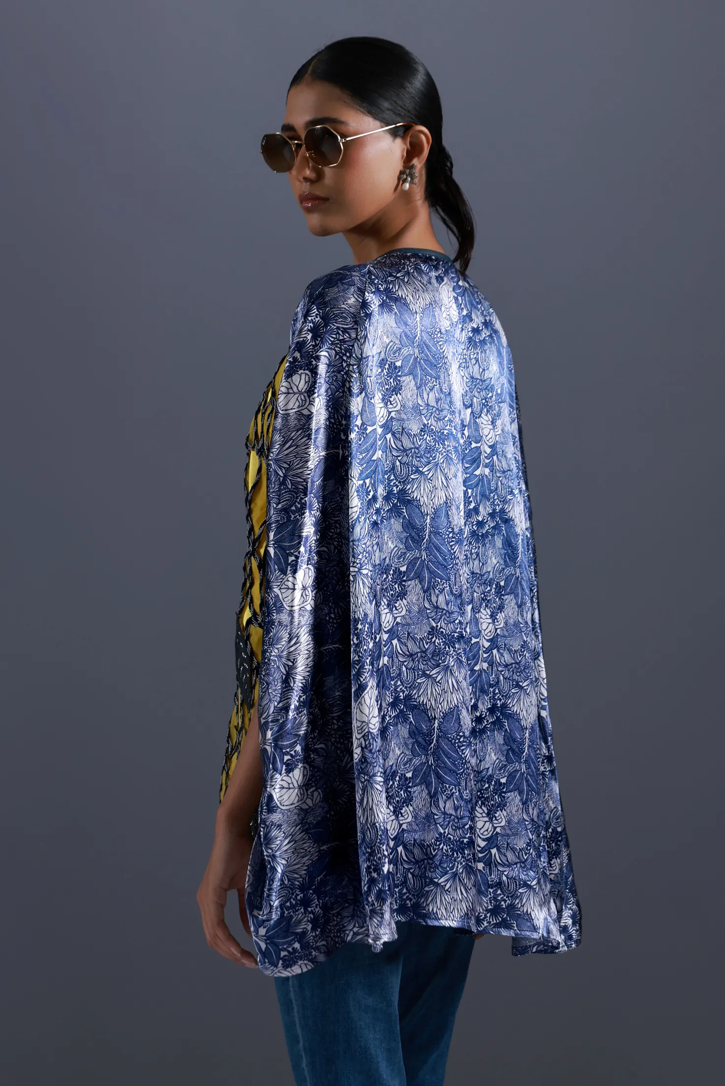 Cape is in combination of thick organza and custom satin print